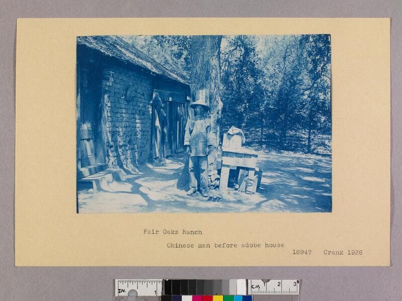 A group of Chinese laborers wearing conical hats, pick grapes in a vineyard. Some are using wooden tubs to collect the grapes, others place them in wooden crates. Vineyard stretches out to the horizon ending at a line of trees.