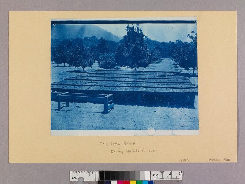 A man wearing a cowboy hat and ascot holds a large tray of apricots near a wooden cabinet fitted with shelves. Behind that is a grove of fruit trees, and mountains in the distance.