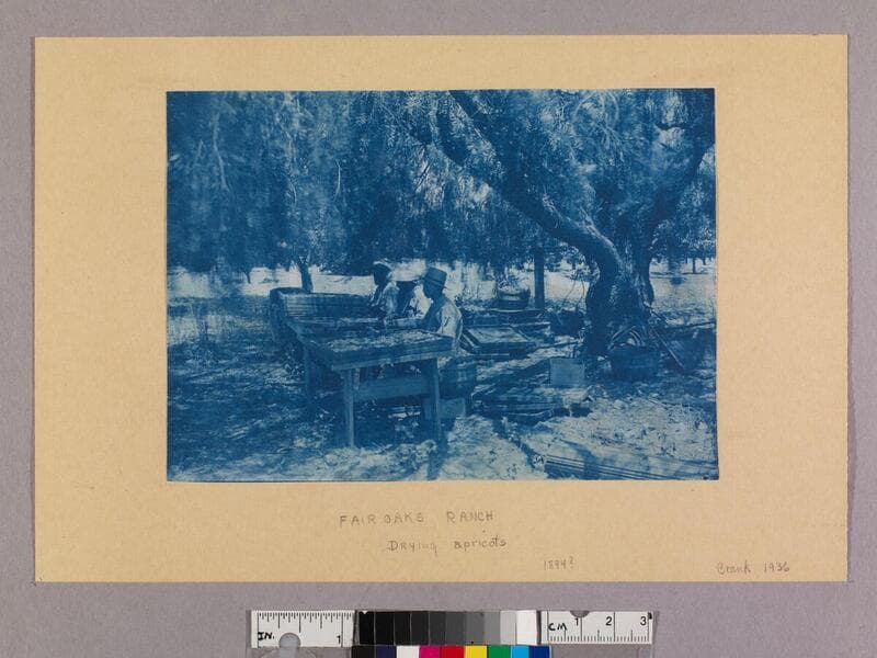 Several rows of wooden drying racks filled with fruit are laid out on the ground in Pasadena, California. Groups of men and women stand in and among the racks, a tent has been pitched in the center. Two horse-drawn carts stand to the right next to stacks of more drying racks.
