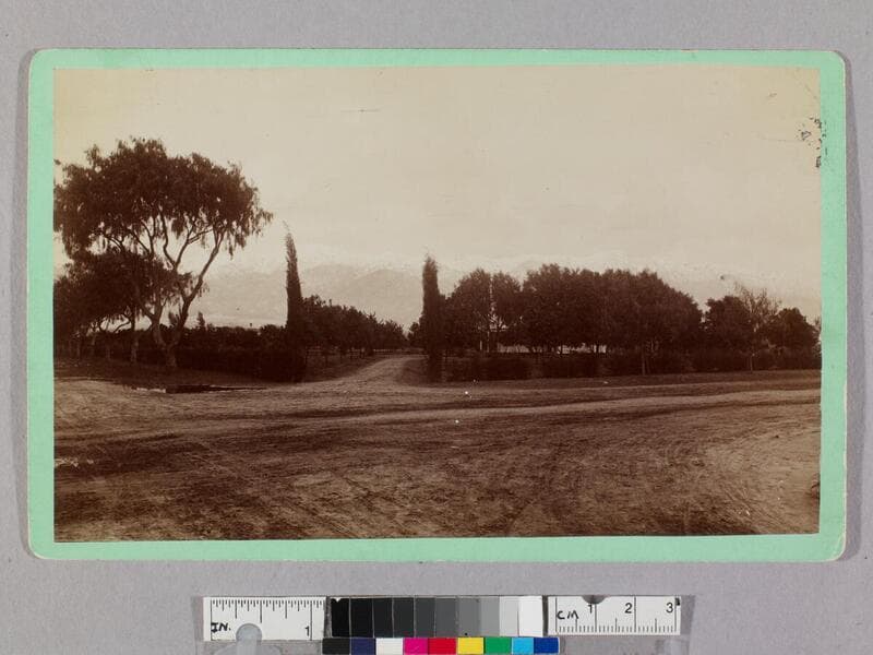 Nine card photographs of views around Pasadena, California, circa 1880s, chiefly depicting the Carmelita estate of Dr. Ezra S. Carr and his wife, Jeanne C. Smith Carr. Includes images of the tree-lined dirt roads around Carmelita and the exterior of the Carrs' house; the planting of a palm tree; a woman with a horse; an orchard, as well as a view of the Sierra Madre Villa Hotel in San Gabriel (now Sierra Madre) and a fountain on the hotel's property; the driveway to the Glen Rosa estate of Thomas Nelmes. Photographers are unidentified on most of the images, though there are imprints for Carleton E. Watkins (photPF 440), Elias A. Bonine (photPF 448), and E.S. Frost & Son (photPF 449), and T.G. Norton & Co (photPF 447).