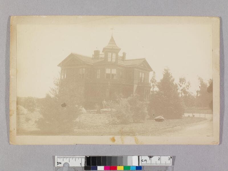 An ornate, Victorian mansion, of Moritz Rosenbaum, in Pasadena, California, with a wraparound porch sits amid landscaped grounds of trees, cactus, and flowers.