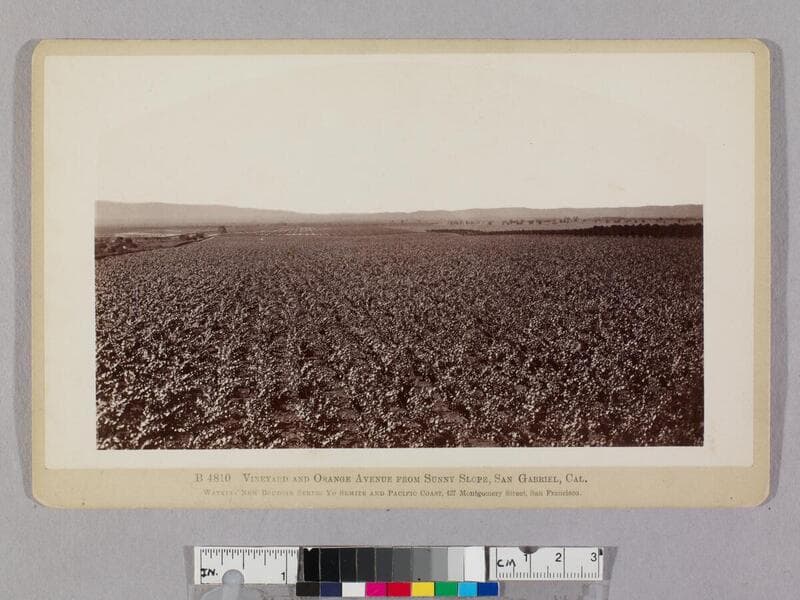 Wide view of vineyard with a wooden outbuilding at the far edge on the Sunny Slope ranch owned by L. J. Rose in San Gabriel, California. A line of trees and the San Gabriel Mountains in the background.