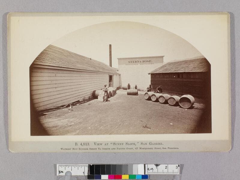 Several winery buildings set atop a hill and along the hillside at the Sunny Slope ranch owned by L. J. Rose in San Gabriel, California, including the Stern & Rose distillery. Workers are scattered among the buildings and road leading up the hill. Wine barrels fill the opening of one of the buildings.