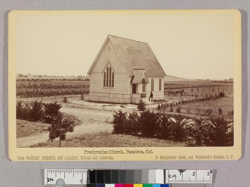 A one-room Presbyterian church in Pasadena, California, sits alone in an open area. A man in dark clothing stands on the front steps, and a horse-drawn carriage is next to a wood post fence behind the building.