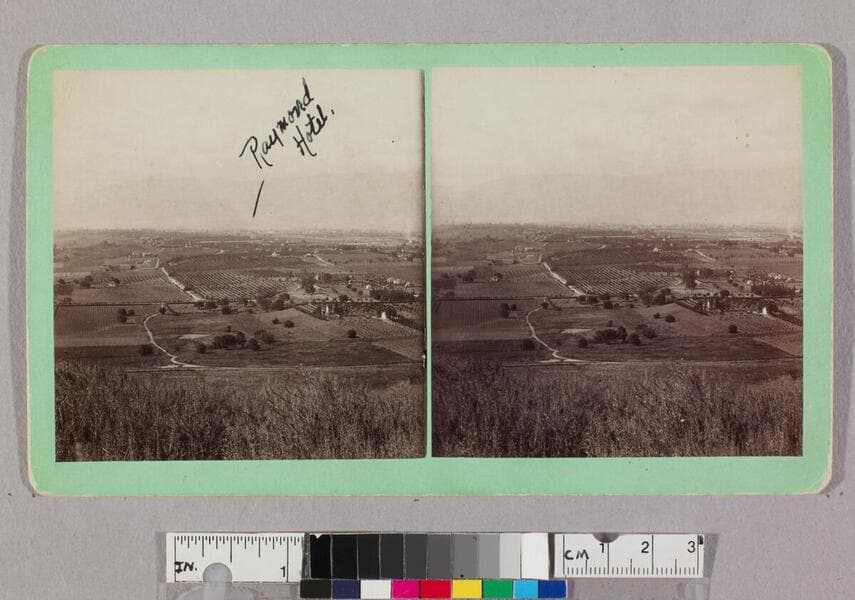 Wide view of open land and agricultural fields dotted with houses and dirt roads. In the distance, the large Raymond Hotel sits atop a razed hilltop in Pasadena, California (on the border of what is now South Pasadena).