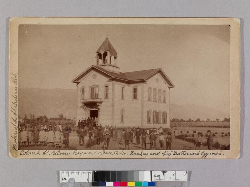 A one-room Presbyterian church stands alone amid an empty, flat landscape in Pasadena, California. A man stands on the front steps of the church, a horse-drawn carriage stand behind it. Rows of trees have been planted around the perimeter.