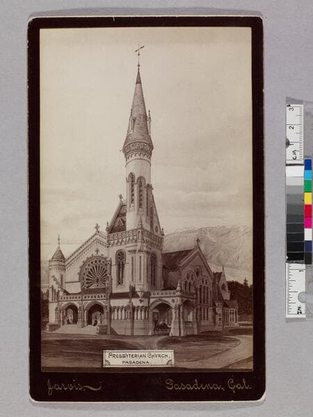 A Congregational church building with stained glass windows and a tall steeple, stands alone at the intersection of two dirt roads in Pasadena, California.