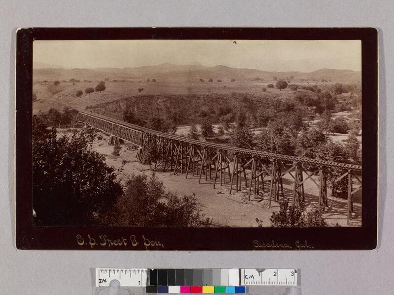 Fourteen cabinet card photographs depicting the construction and opening of the Los Angeles and San Gabriel Valley Railroad (L.A. & S.G.V.R.R.) in the Los Angeles and Pasadena, California, area in 1885. The images document workers laying the track, railroad bridges (including the wooden trestle bridge across the Arroyo Seco river bed, the exterior and interior of passenger cars, and the Downey Avenue station in Los Angeles, as well as two images related to the opening celebrations of the railroad on September 16, 1885 in Pasadena (photPF 557 and 567). Depicted among the images is the first Pasadena Public Library (photPF 566). Photographs include photographer imprints for E.S. Frost & Son (photPF 556-558, 560-565, 568-569), and J.T. Tuttle & Co. (photPF 559).