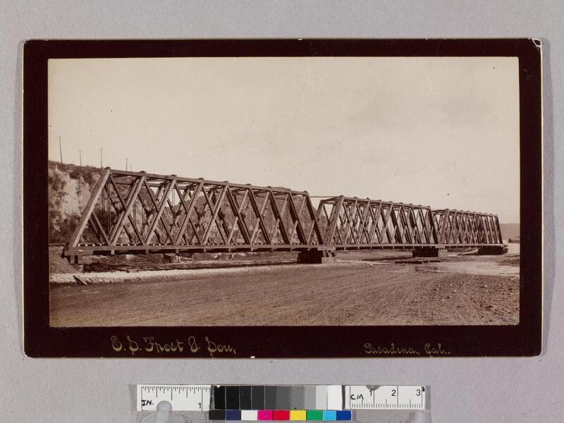 A railroad trestle bridge of the Los Angeles and San Gabriel Valley Railroad stretches across the wide dry river bed of the Arroyo Seco near Pasadena, California. A few men stand underneath the structure.