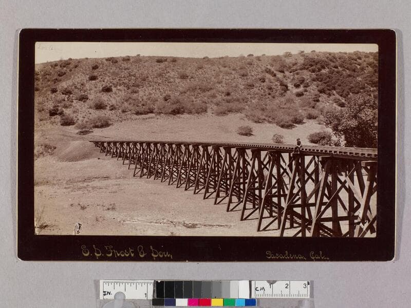 A railroad trestle bridge of the Los Angeles and San Gabriel Valley Railroad stretches across the wide dry river bed of the Arroyo Seco near Pasadena, California. A few men stand underneath the structure.