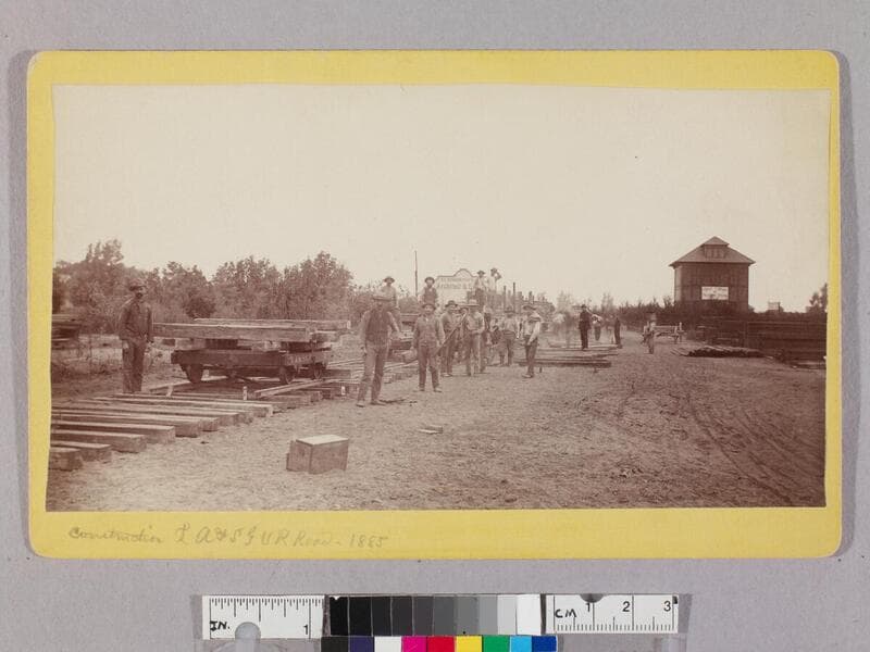 Long wooden railroad trestle bridge of the Los Angeles and San Gabriel Valley Railroad crosses the wide dry river bed of the Arroyo Seco near Pasadena, California. A single man sits to the right on the tracks with his legs dangling off the edge.