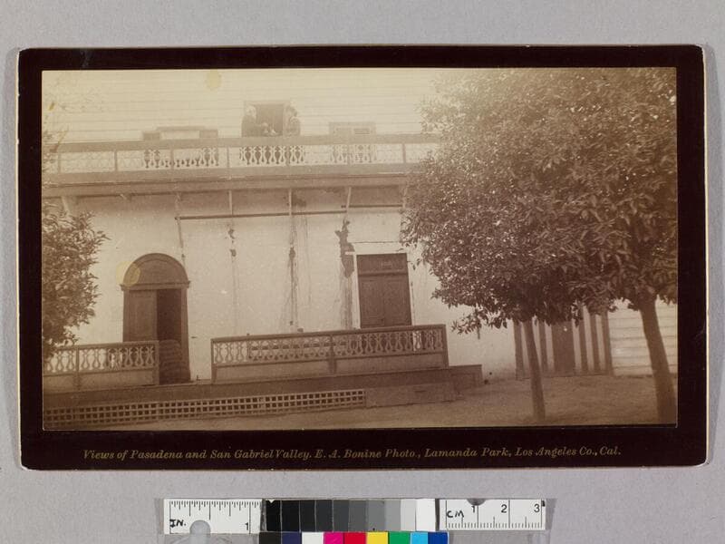 Three card photographs depict the El Ranchito adobe and ranch property of Pío Pico in Whittier, California, with two showing the exteriors of adobe ranch buildings with Hispanic men, women, and children standing in front, and one depicting the exterior of the two-story adobe house with Pío Pico standing on a balcony with Pasadena naturalist Jeanne Carr. The photographs are by Pasadena photographers Jarvis (photPF 590) and E.A. Bonine (photPF 591-592).