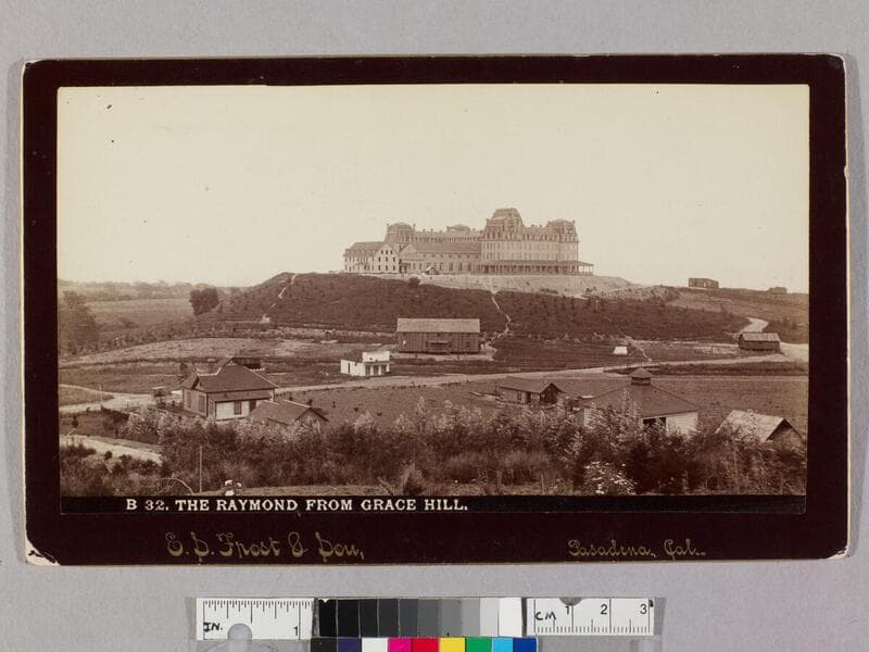 Four card photographs depicting exterior of the Raymond Hotel and the surrounding landscape in Pasadena, California (and what is now South Pasadena) during the final stages of construction in 1885 and 1886. Three of the photographs are cabinet cards and photPF 596 is a stereograph. Photographer imprints are E.S. Frost & Son (photPF 593-594) and J.T. Tuttle & Co. (photPF 595). Stereographs 597, 598 and 599 have been moved to Stereo file: photST.