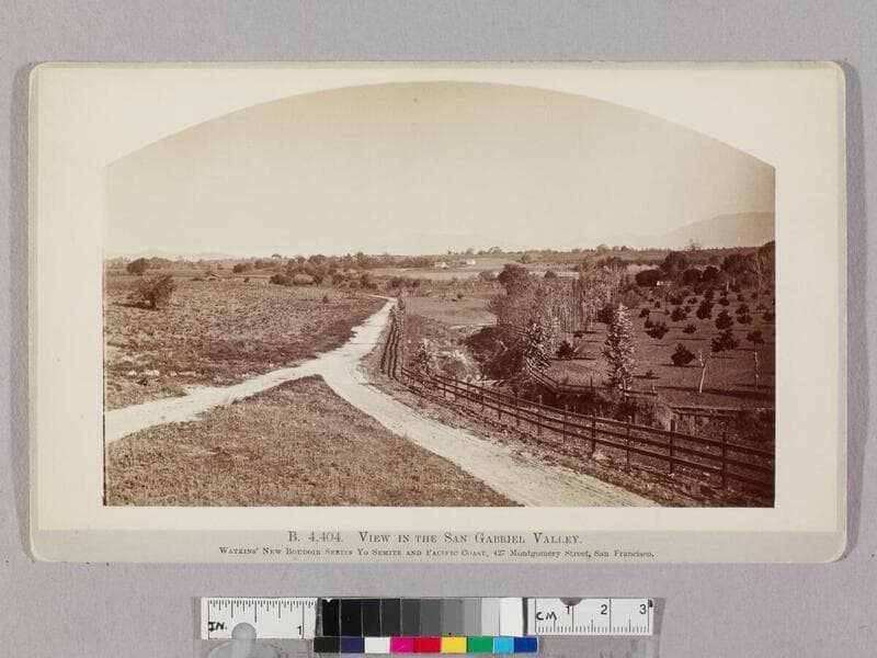 Landscape view of a dirt road running along a wood post fence between a vineyard and landscaped garden on the Willow Dale estate of Nathaniel C. Carter in San Gabriel (now San Marino, California). The road forks off in to the left out of frame.
