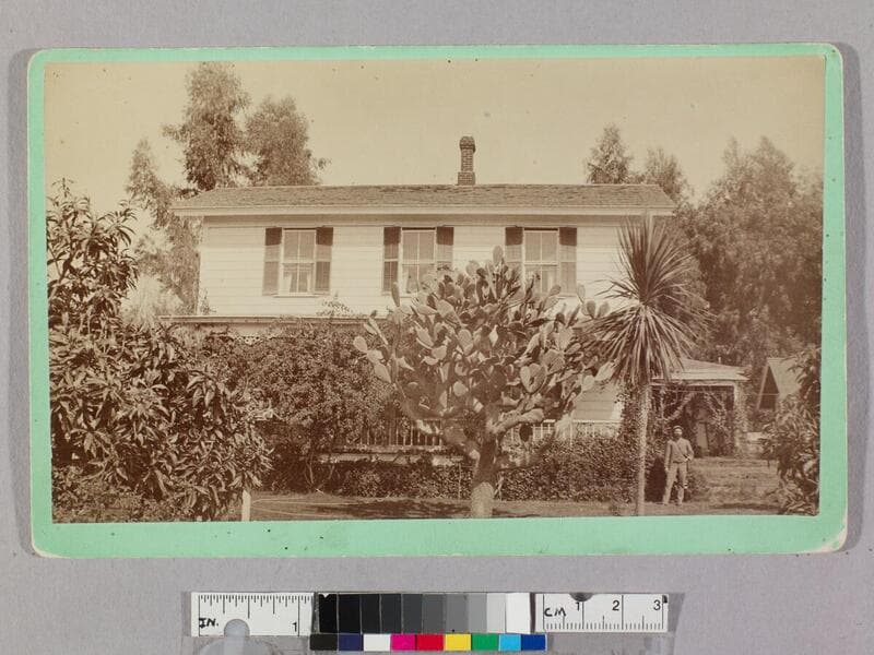 The two-story residence of Nathaniel C. Carter on the Willow Dale estate in San Gabriel (now San Marino, California), with porch, sits on a gentle slope with a fenced-in garden in front. To the left, a horse-drawn carriage and a woman astride another horse, and a vineyard is planted in the foreground.