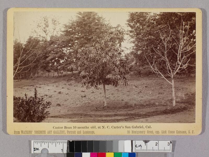 A young castor bean tree with a thin trunk in the foreground, and behind it, a flat, empty area and a few more trees on the Willow Dale estate of Nathaniel C. Carter in San Gabriel (now San Marino, California).
