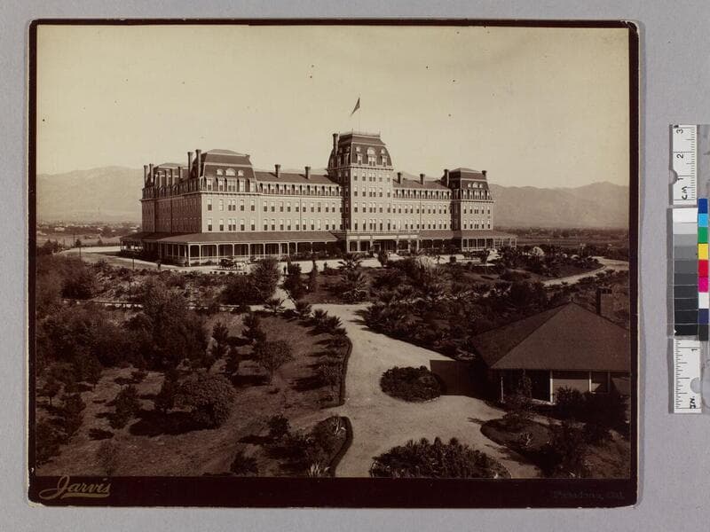 Exterior view of the multi-story Raymond Hotel in Pasadena, California (in what is now South Pasadena), with a porch that wraps around entire building, in the final stages of construction. An individual in a hat, sits at the top of a stone stairway leading up the hill to the hotel. Grounds are not yet landscaped.