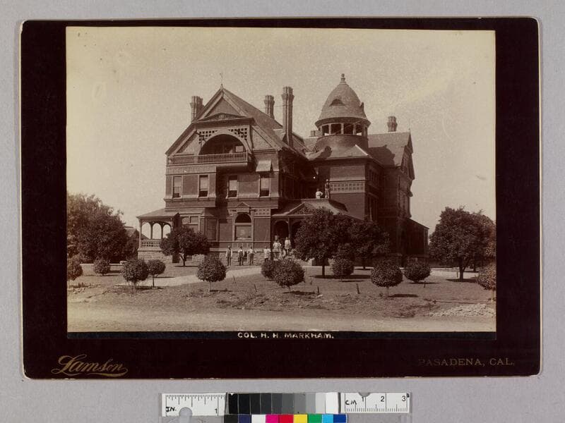 An ornate, Victorian mansion, of Moritz Rosenbaum, in Pasadena, California, with a wraparound porch sits amid landscaped grounds of trees, cactus, and flowers.