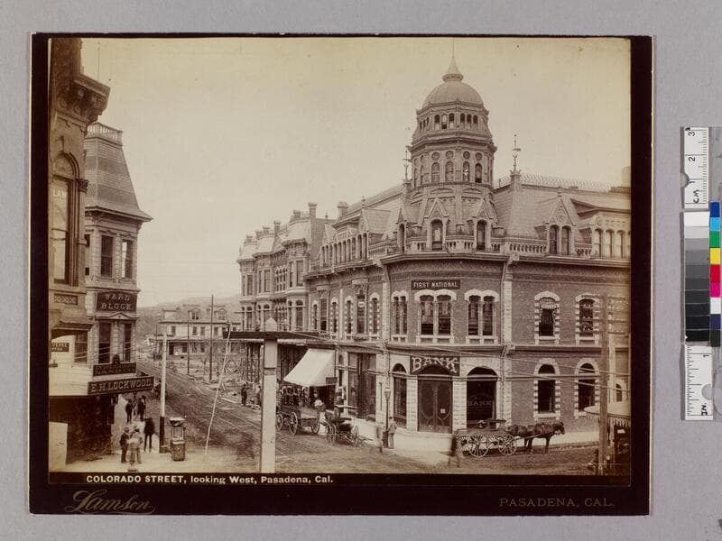 View down a business thoroughfare lined with two and three-story buildings and storefronts on Colorado Street in Pasadena, California. People and horse-drawn carriages are scattered on the sidewalks and road. Visible signs on buildings including "Hubbard & Co. Groceries & Queensware,"F. D. Stevens Hardware," the Ward Block, a bank, and a job printing business.