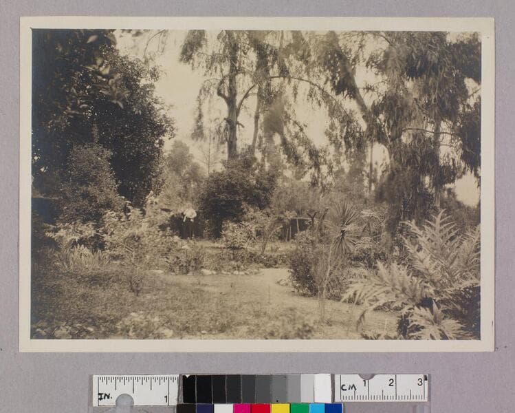 An older woman stands in profile in a landscaped garden of trees, flowers, and other plants in Pasadena, California. The upper part of a residence is visible through the trees in the upper left.