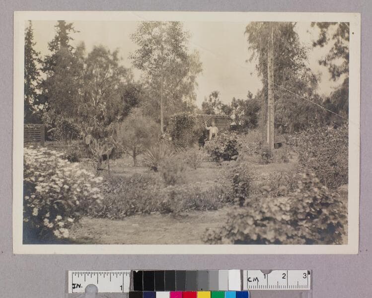 An older woman stands in profile in a landscaped garden of trees, flowers, and other plants in Pasadena, California. The upper part of a residence is visible through the trees in the upper left.