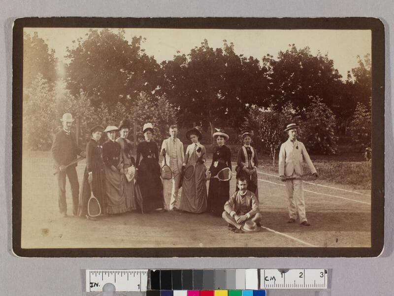 A group of men and women, several holding rackets, stand on a tennis court on the property of William F. Channing and family in Pasadena, California. In the upper left is a two-story residence, to the right, people sit on bleachers under a canopy. Tennis players include Charles Saunders, Harold Channing, and Grace Ellery Channing.