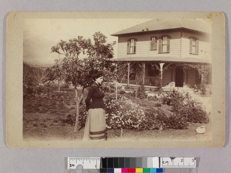 Writer Charlotte Perkins Gilman (then Stetson) seen in profile, stands in garden area; to the right is the house of Willis Masters and his family in Pasadena, California, covered with climbing plants.