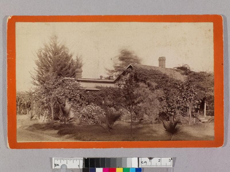 Writer Charlotte Perkins Gilman (then Stetson) seen in profile, stands in garden area; to the right is the house of Willis Masters and his family in Pasadena, California, covered with climbing plants.