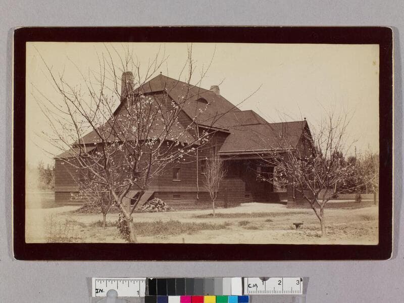 Exterior of the back of the two-story residence of Dr. William F. Channing and his family in Pasadena, California. Young fruit trees are scattered around the grounds, and an outbuilding sits in a grove of trees to the left.