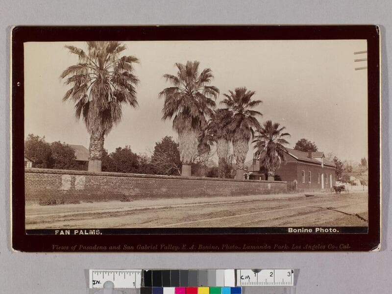 Two palm trees stand side-by-side in San Gabriel (presumably now San Marino, California). Behind them are agricultural fields planted with grape vines.