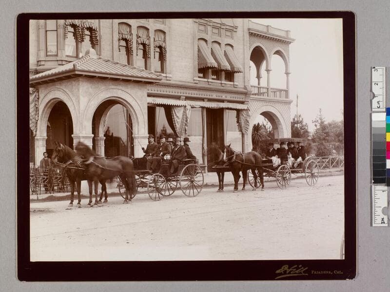 A horse-dawn carriage carrying a group of men and women, who are going sightseeing as part of the first semi-annual meeting of the Southern California Hotel Association on November 22, 1894, is parked in front of the Hotel Green in Pasadena, California. A woman looks down from a balcony above, and several people stand under the arched, covered entryway. The name "Morgan's Livery, Pasadena," is painted on the side of carriage.