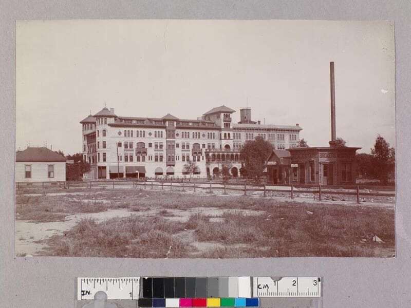 - The Hotel Green in Pasadena, California, seen from a distance next to an area of flat, patchy land. To the right is a small, one-story building with signs reading, "Shoes Repaired," "Dress Making," and "Wooster & Cahill. Insurance. Loans. Real Estate. Brokers. Negotiated."