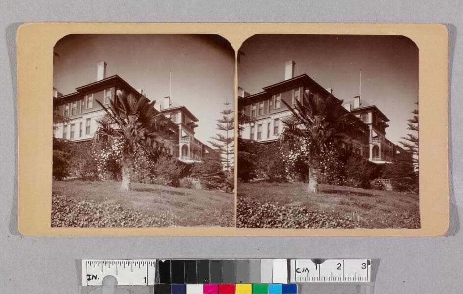 Seen from a distance, an extravagant Victorian mansion sitting atop a hill. In the foreground, a road lined with an immense agave plants and landscaping.