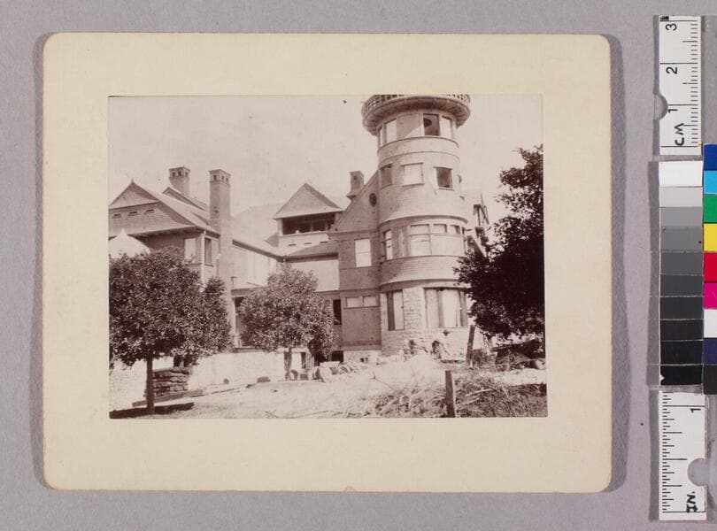 Exterior view of the sprawling Victorian mansion built for Thaddeus Lowe, with a five-story observatory tower with a domed roof, in Pasadena, California. A manicured lawn and landscaping in the foreground.