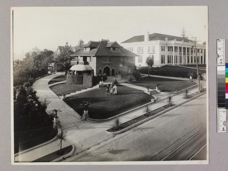 The two-story residence of W. C. Stuart in the Spanish colonial style, sits behind a manicured lawn and landscaping at 1201 S. Orange Grove in Pasadena, California.