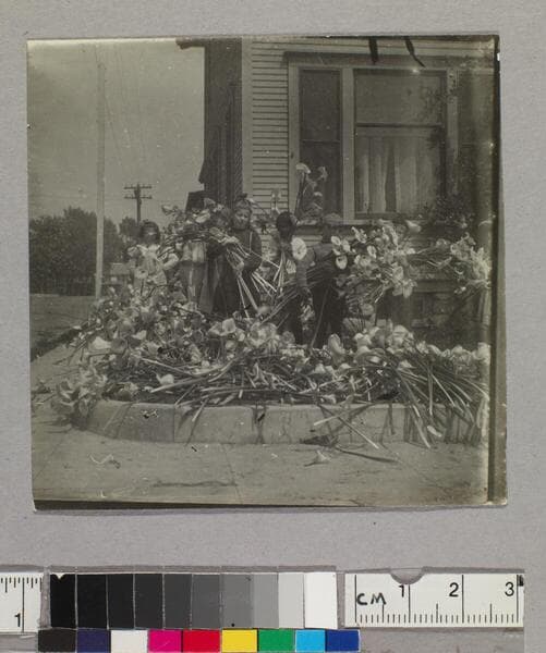Women and children decorate an arched trellis with greenery and calla lilies in Pasadena, California, for the visit of United States President Theodore Roosevelt in 1903.