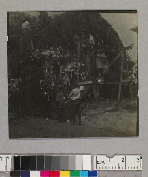 A group of children stand next to a residence in Pasadena, California, amid dozens of cut calla lilies to be used to decorate an arch for the visit of United States President Theodore Roosevelt in 1903. Some hold bunches of the flowers.