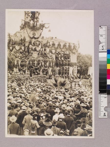 A walkway strewn with roses leads toward the Wilson school building in Pasadena, California, which is covered with elaborate floral decoration for a visit and speech by United States President Theodore Roosevelt. Men, women, and children are gathered on either side of the walkway, which is roped off at the front.
