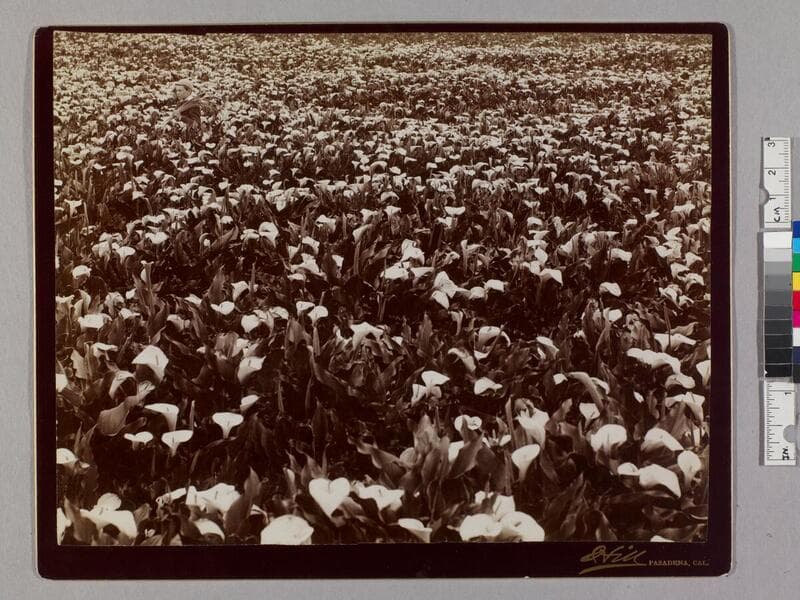 A group of children stand next to a residence in Pasadena, California, amid dozens of cut calla lilies to be used to decorate an arch for the visit of United States President Theodore Roosevelt in 1903. Some hold bunches of the flowers.