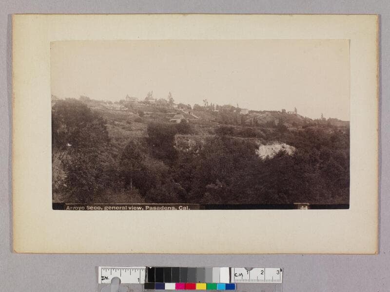 View up the sloping side of the Arroyo Seco, in Pasadena, California, covered with trees and vegetation, and a dirt road at left. Towards the top are a few houses and outbuildings, including the Belvoir estate of Frederick K. Clark with terraces and stairs visible near top center.