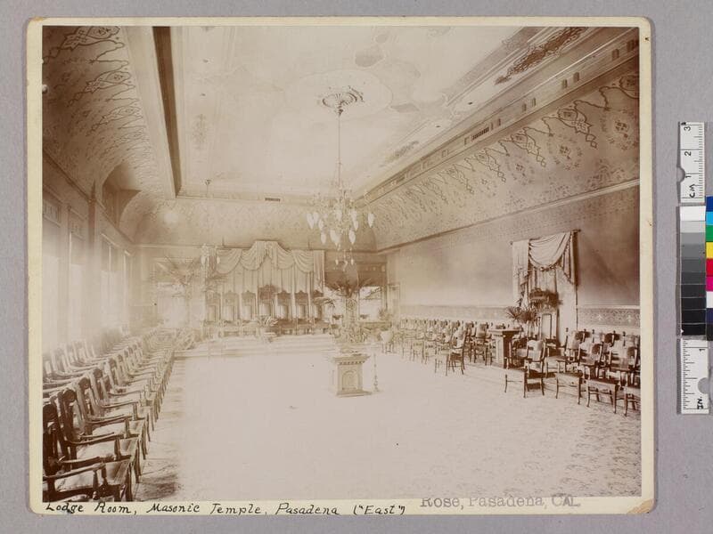 View of the circulating room of the Pasadena Public Library, a high-ceilinged room with wood bookshelves and paneling, tapestries, multiple tables and chairs, and circulation and information desks on the left and in the center. The chairs and desks are unoccupied, and there are no books on the shelves. The library's address is 285 East Walnut.
