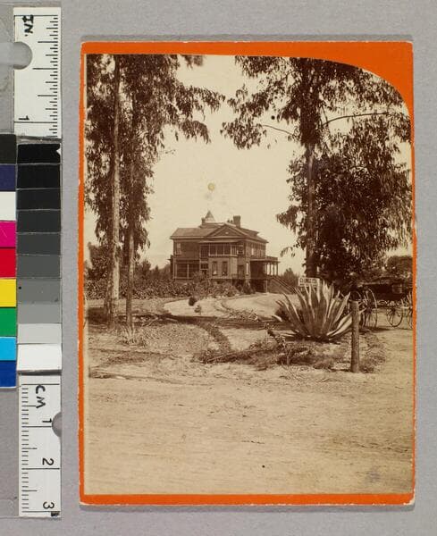 Intersection of two dirt roads at the entrance to Carmelita, the estate of Dr. Ezra Carr and his wife, Jeanne C. Carr, in Pasadena, California. On the right is a driveway running through two rows of trees. On the left, a house is partially visible. A horse-drawn carriage is on the perpendicular road in the distance.