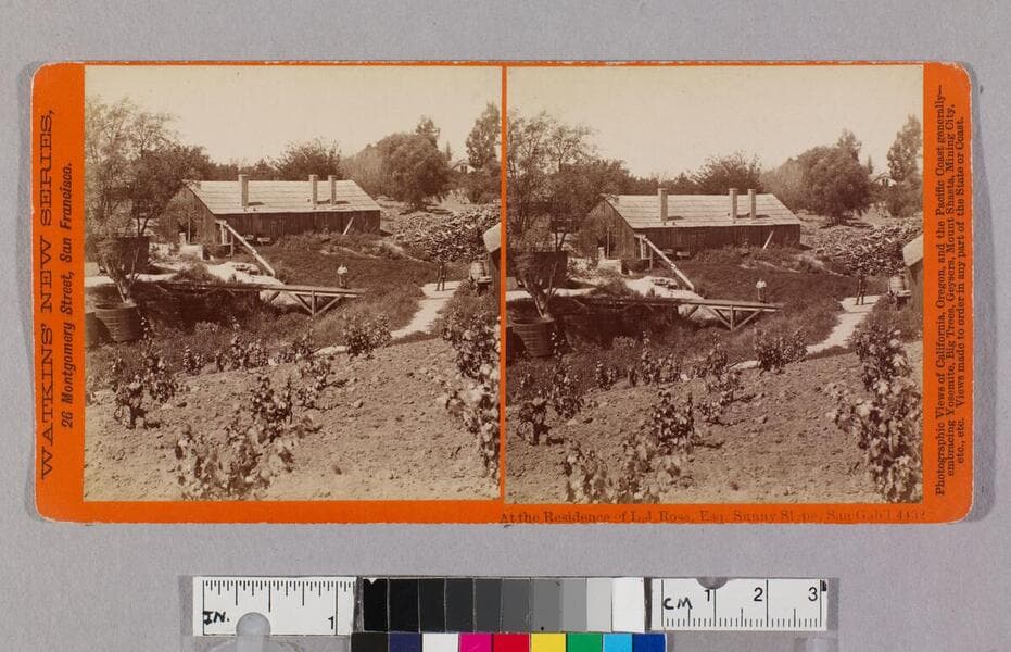 View of the Sunny Slope ranch owned by L. J. Rose in San Gabriel, California, with a vineyard and orchard in the foreground. A two-story home sits among trees in the distance to the left.