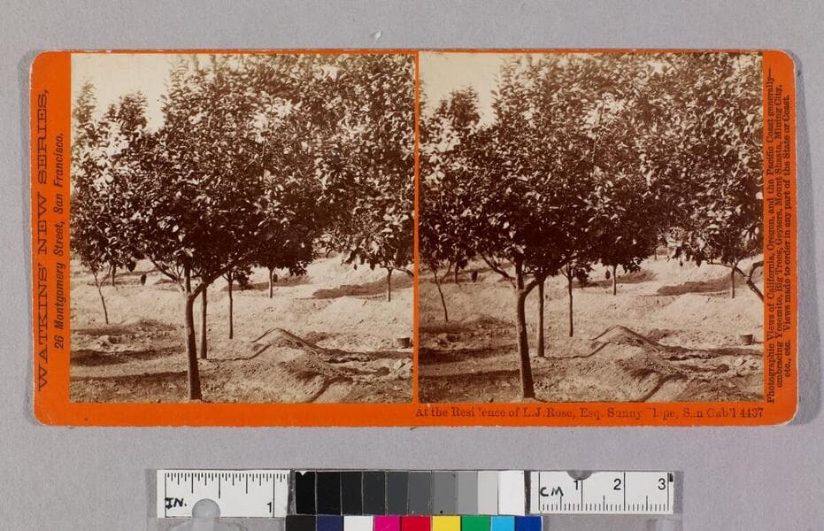 View of the Sunny Slope ranch owned by L. J. Rose in San Gabriel, California, with a vineyard and orchard in the foreground. A two-story home sits among trees in the distance to the left.