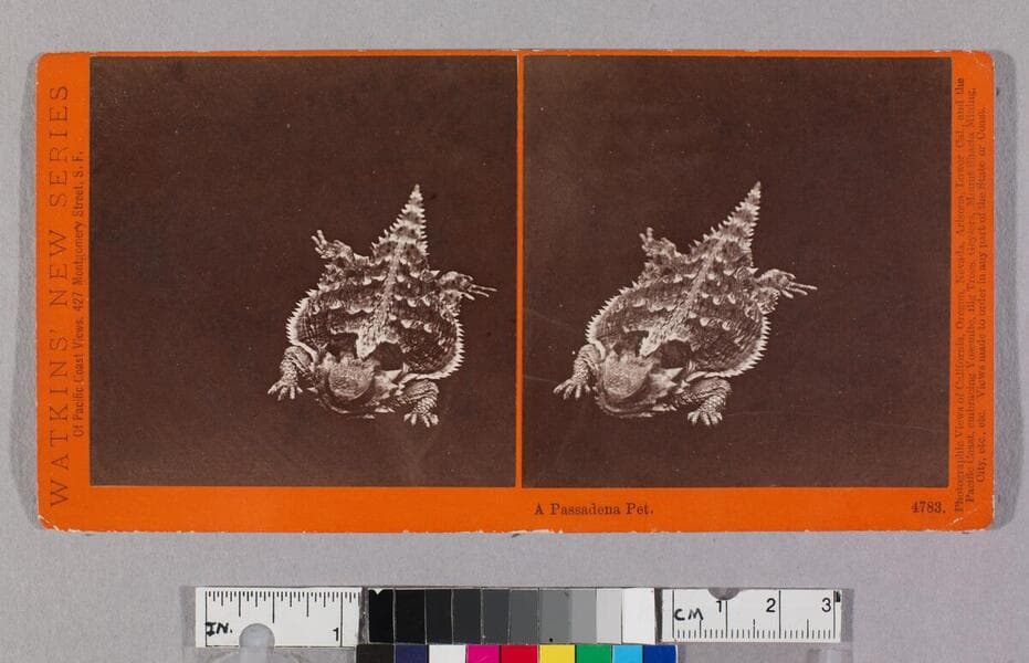 Landscape view of empty land, scattered trees, orchards, and vineyards around Pasadena, California, as seen from Bacon's Hill, located on the (modern-day) border between Pasadena and South Pasadena. A few houses and mountains in the distance.