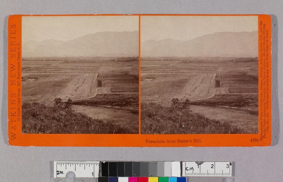 Landscape view of empty land, scattered trees, orchards, and vineyards around Pasadena, California, as seen from Bacon's Hill, located on the (modern-day) border between Pasadena and South Pasadena. A few houses and mountains in the distance.