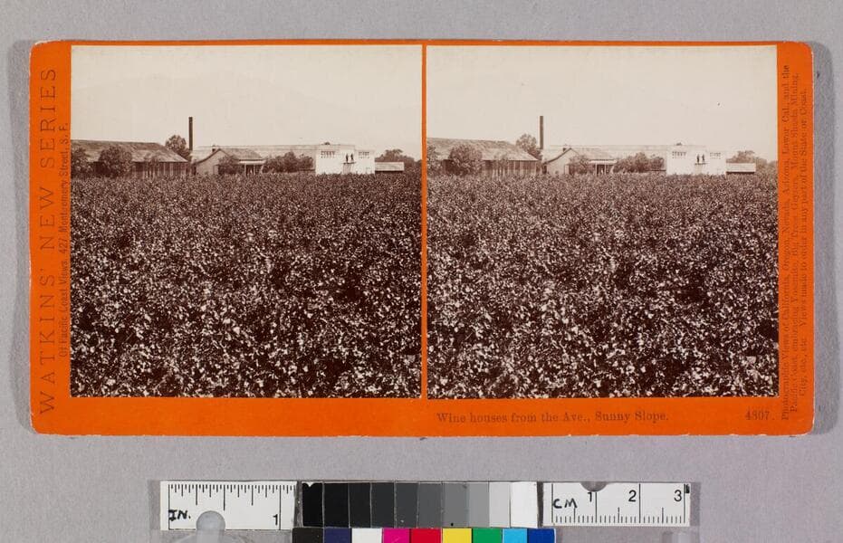 Vineyards in the foreground, and winery buildings in the distance on the Sunny Slope ranch owned by L. J. Rose in San Gabriel, California. On the right, two men stand on a platform on the side of a white building, with "Sunny Slope" painted in large letters near the top.