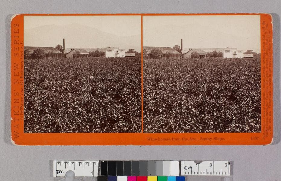 Vineyards in the foreground, and winery buildings in the distance on the Sunny Slope ranch owned by L. J. Rose in San Gabriel, California. On the right, two men stand on a platform on the side of a white building, with "Sunny Slope" painted in large letters near the top.