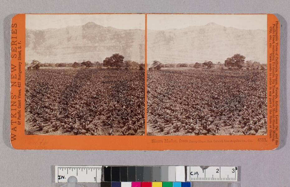 Wide view of a vineyard, with open, flat land dotted with trees in the distance, on the Sunny Slope ranch owned by L. J. Rose in San Gabriel, California.
