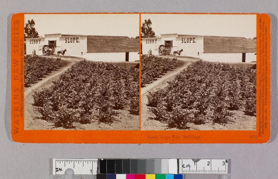 Vineyards in the foreground, and winery buildings in the distance on the Sunny Slope ranch owned by L. J. Rose in San Gabriel, California. On the right, two men stand on a platform on the side of a white building, with "Sunny Slope" painted in large letters near the top.